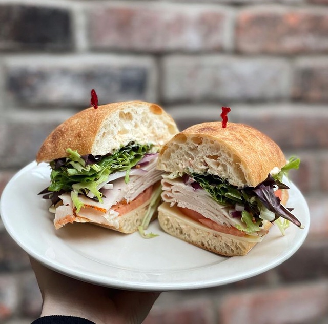 turkey, white cheddar, tomato, red onion, mixed greens & chipotle bacon mayo on ciabatta